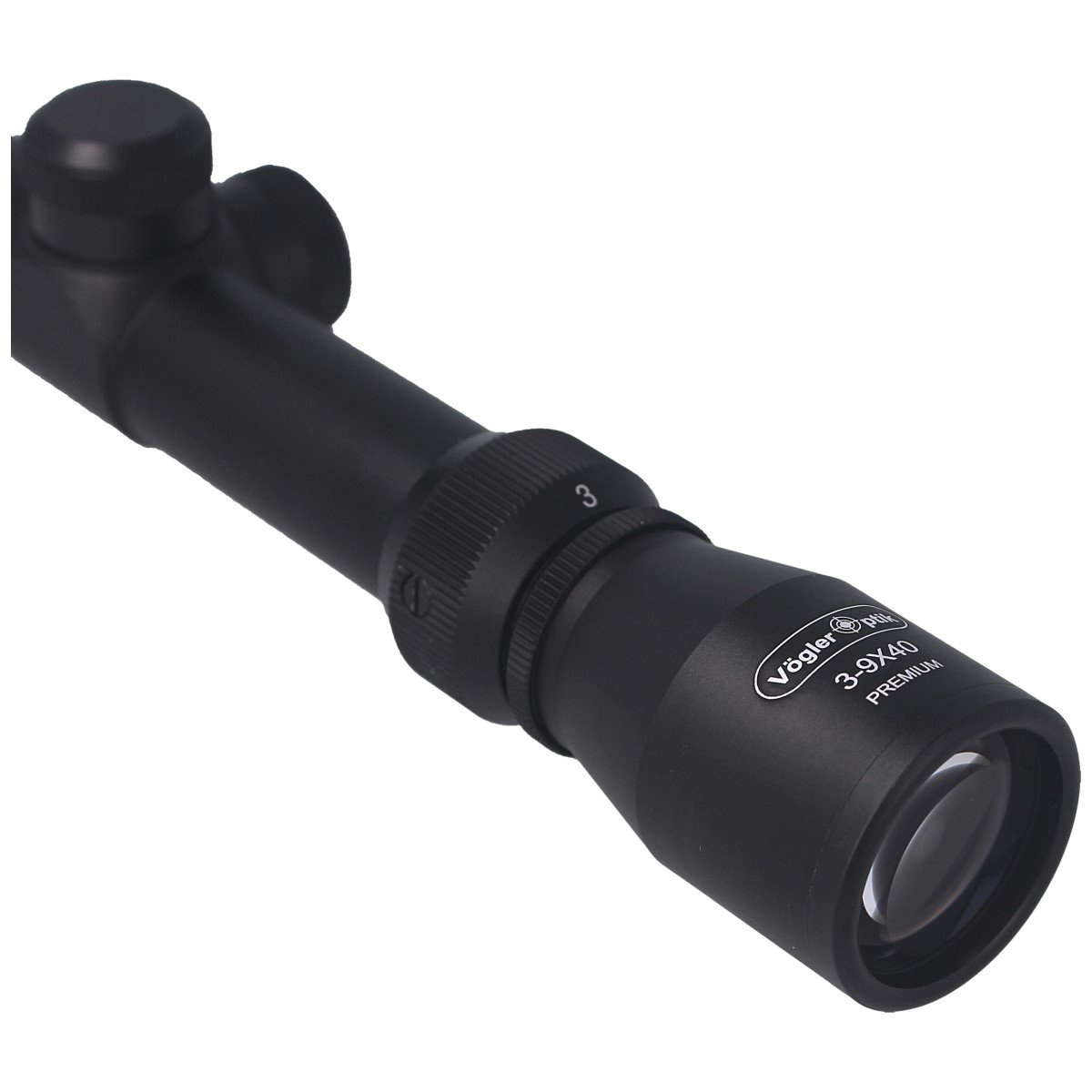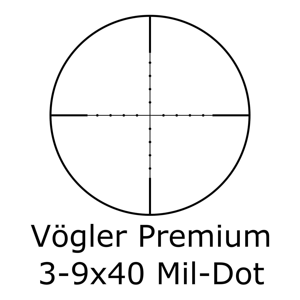 Optical scope by Vögler Optik from the enhanced Premium series featuring a MilDot reticle. Multi-layer, anti-reflective coatings on the glass lenses and a nitrogen-filled tube guarantee a bright, clear image. Variable magnification of 3-9x, with an objective diameter of 40 mm, offering an excellent price-to-quality ratio! Recoil-resistant, suitable for powerful air rifles and small caliber rifles .22, .223. Simply a bestseller!