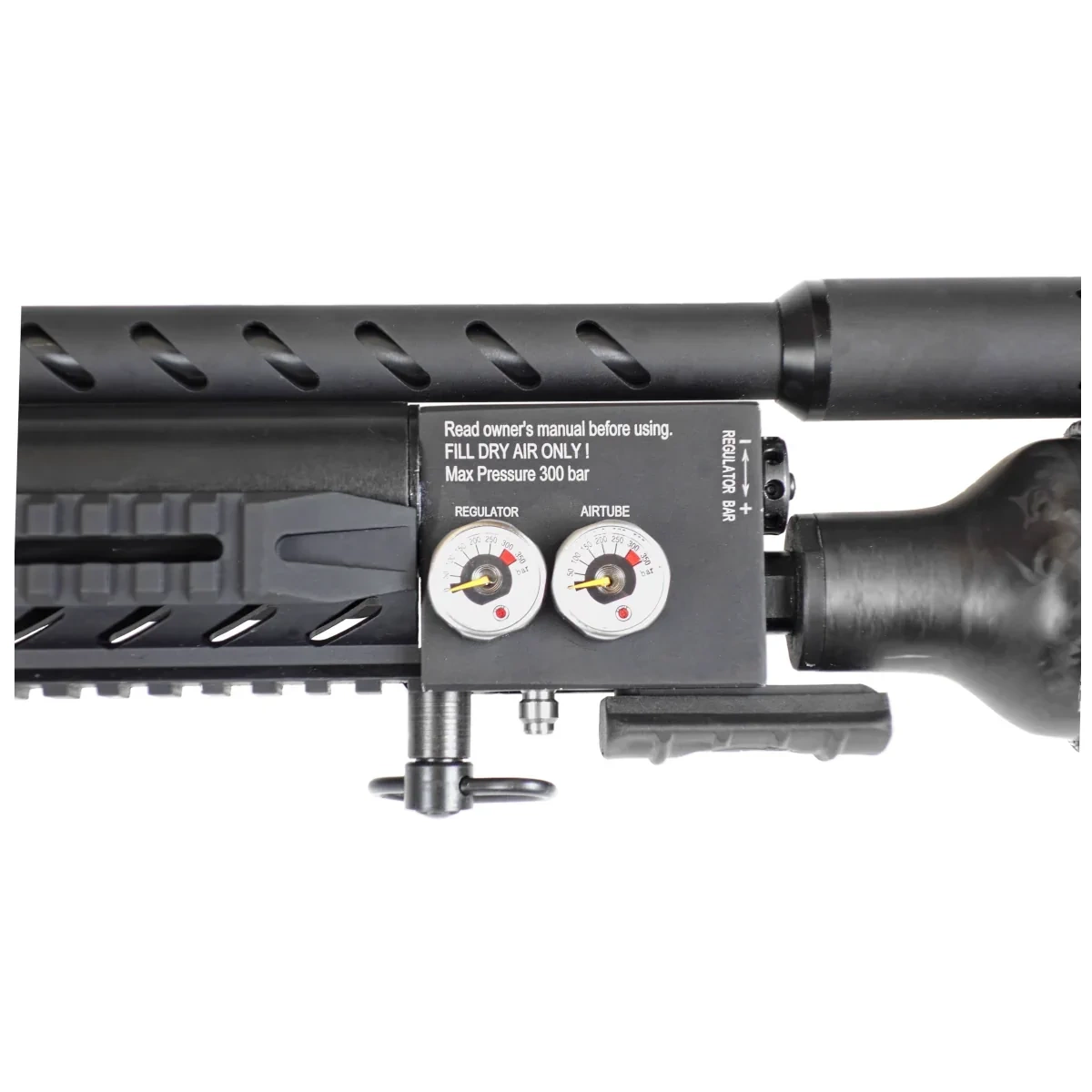 Air Supply – Powered by a 480cc carbon air cylinder located beneath the barrel. A fully charged cylinder allows for 60 to 75 effective shots depending on the caliber (FAC version data). Dual pressure gauges monitor the cylinder and regulator chamber pressure for optimal control. Maximum fill pressure is 300 bar, with a recommended minimum working pressure of 130 bar.