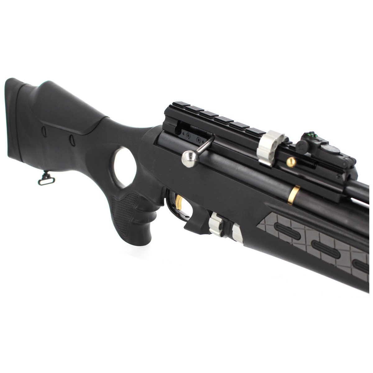 Zasilanie - wymienny zbiornik sprężonego powietrza o pojemności 255 cc. W pełni naładowany kartusz pozwala na oddanie od 25 do 30 efektywnych strzałów w zależności od kalibru wiatrówki (dane dla wersji FAC*). Wbudowany manometr pozwala kontrolować ciśnienie znajdujące się w zbiorniku, a tym samym stopnień jego naładowania. Obrotowy pierścień chroni wlot ładowania przed uszkodzeniem. Po opróżnieniu sprężonego powietrza, pusty kartusz może zostać zastąpiony nowym napełnionym (opcja). Stanowi to doskonałe rozwiązanie dla osób nie zamierzających zabierać pompki PCP czy butli na strzelnicę. 130 bar minimalne ciśnienie robocze w kartuszu rekomendowane przez producenta.