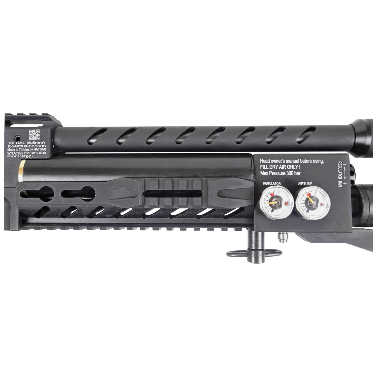 Air Supply – Powered by a 480cc carbon air cylinder located beneath the barrel. A fully charged cylinder allows for 60 to 75 effective shots depending on the caliber (FAC version data). Dual pressure gauges monitor the cylinder and regulator chamber pressure for optimal control. Maximum fill pressure is 300 bar, with a recommended minimum working pressure of 130 bar.