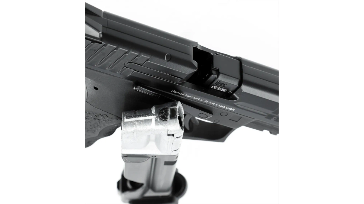 The pistol is equipped with mechanical sights with white markings (front sight), facilitating faster and more instinctive alignment of the front and rear sights in low-light conditions. The front of the frame features a Picatinny accessory rail for mounting a laser sight or tactical flashlight. Licensed Heckler & Koch manufacturer markings are applied on the slide and frame.