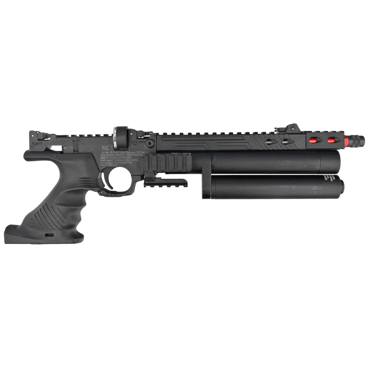 Hatsan Jet II RG PCP Air Pistol with Regulator, 4.5 mm is a modern pneumatic model offering high precision and performance. Equipped with a PCP (Pre-Charged Pneumatic) system, a built-in pressure regulator, and dual air cylinders, it ensures stable operation and extended shooting autonomy. Ideal for sport shooting, recreational use, and precision training.