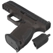 The pistol is designed for both left- and right-handed users, with a reversible magazine release button.