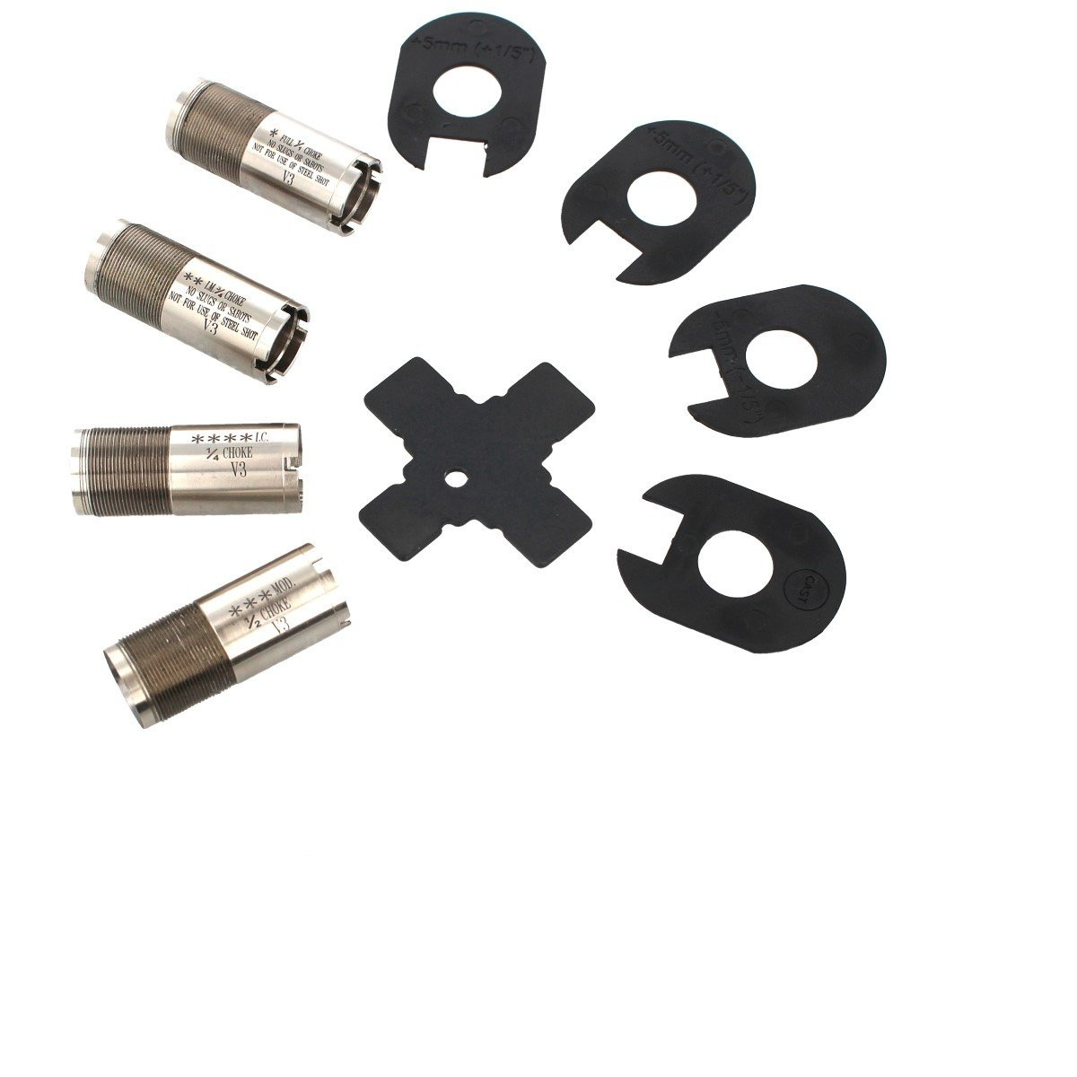 - Podkładki dystansowe - umożliwiające regulację kąta nachylenia kolby w dwóch płaszczyznach. Dzięki zawartym w zestawie czterem podkładkom dystansującym proces dostosowania strzelby do własnych potrzeb jest szybki i nieskomplikowany. Wystarczy włożyć odpowiednio wyprofilowane podkładki dystansujące między komorę zamkową a kolbę aby skonfigurować strzelbę zgodnie z własnymi preferencjami jak i stylem strzelania.